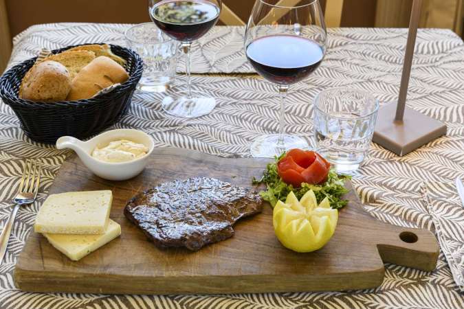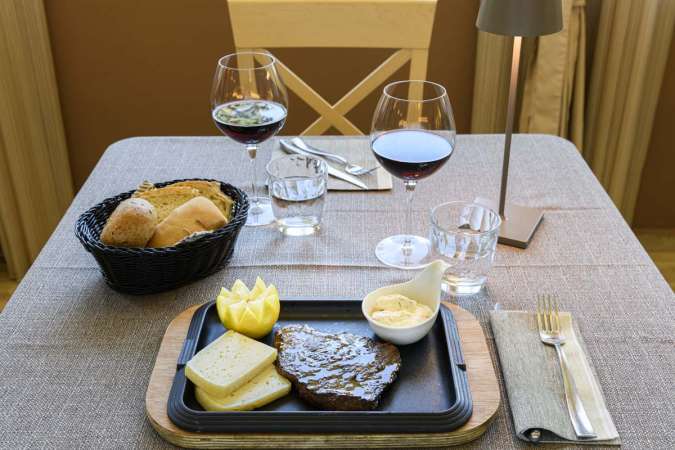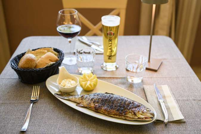 Auf unserer Speisekarte finden Sie auch Fleisch und Fisch vom Grill, sorgfältig über offenem Holzfeuer gegart und liebevoll serviert.